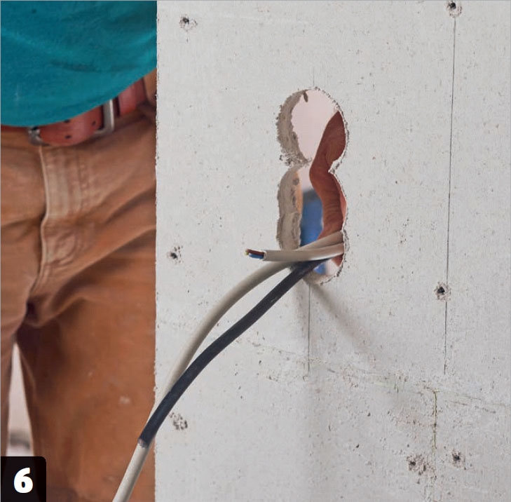 Ledningene trekkes på plass i hullet, slik at de er klare til elektrikeren kommer. Etterpå kan det monteres gipsplater på baksiden.