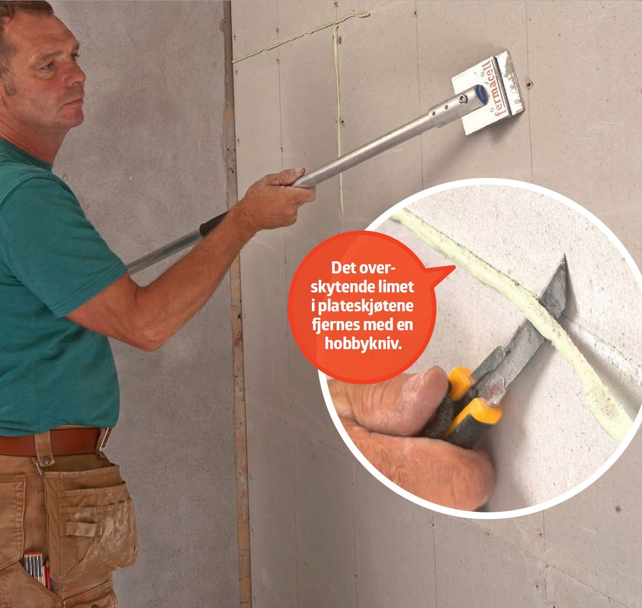 Når platene er montert, skal du sparkle hull og fjerne lim i plateskjøtene.