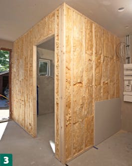 Når du har satt opp fibergipsplater på den ene siden av stenderverket, skal du isolere veggene. Det gjør du enkelt og effektivt med mineralull, som skjæres til med en kniv så den passer mellom stenderne. Mineralull fås i en tykkelse på 75 mm, som passer perfekt til tykkelsen på lektene.