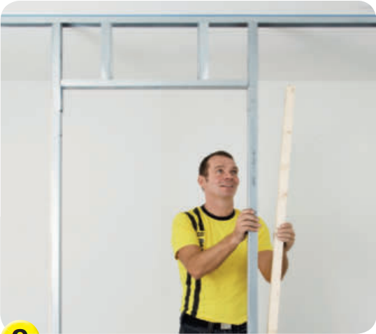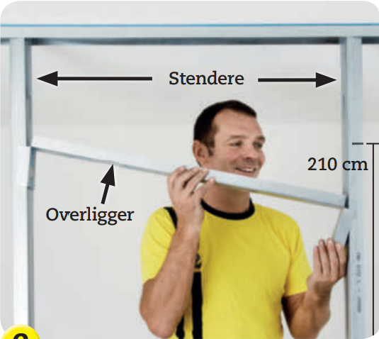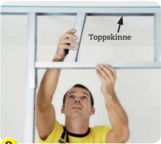 Sett korte stendere mellom overliggeren og toppskinnen. De skal settes slik at de passer med inndelingen av veggens øvrige stendere. De står per 45 eller 60 cm, avhengig av gipsplatebredden.