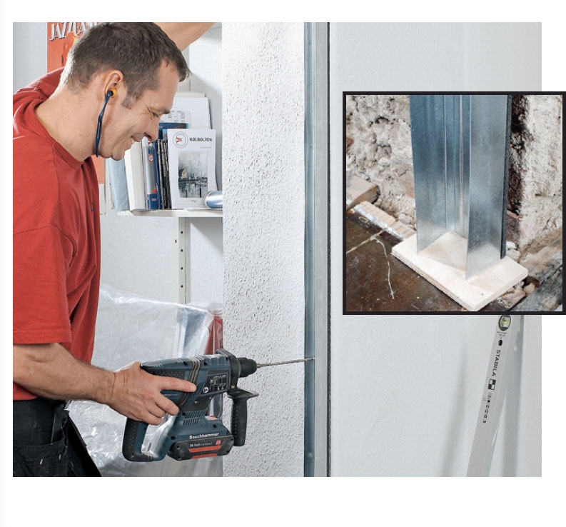 Svake vegger gjør det vanskelig å skru fast stålskinnene. I stedet lar vi gulvet holde skinnene. Vi legger en 6 mm kloss under den loddrette skinna ved muren, borer opp og skrur fast lekta.