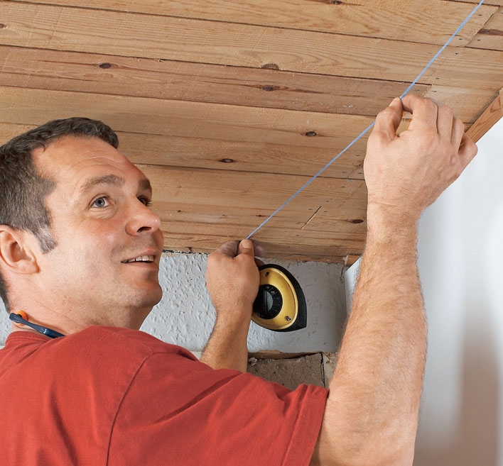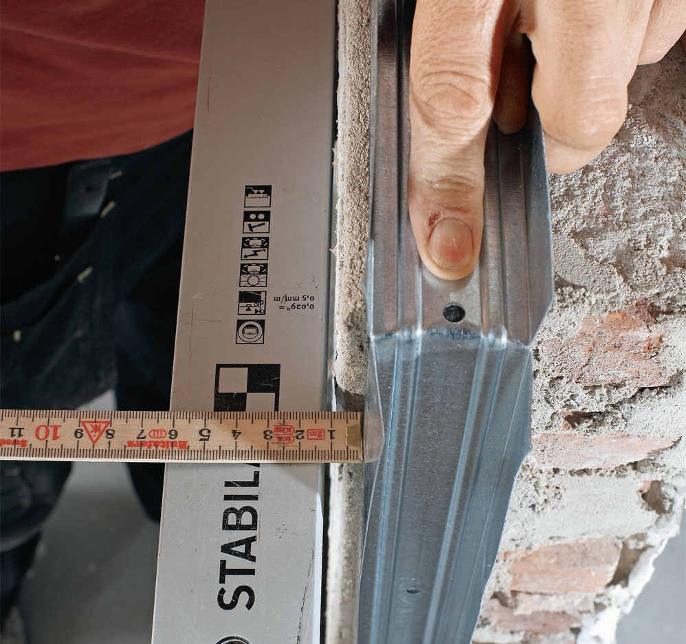 Lag en strek i taket og på gulvet fra de loddrette stenderne på hver side av rommet. Ei krittsnor er til god hjelp.
