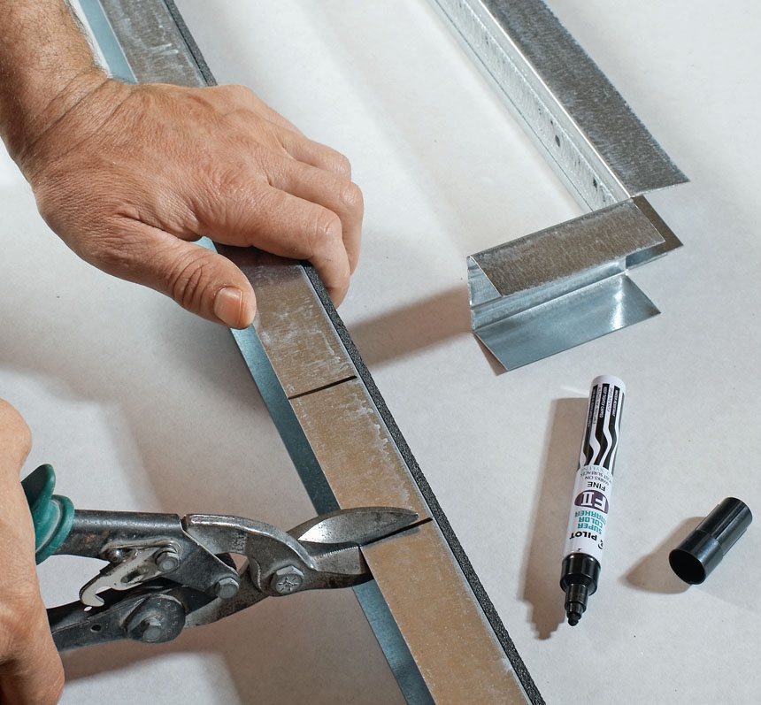 TIPS: Skjærer du den loddrette stenderen 5-6 mm for kort øverst, kan du skyve inn toppskinna over slik at den holdes på plass.