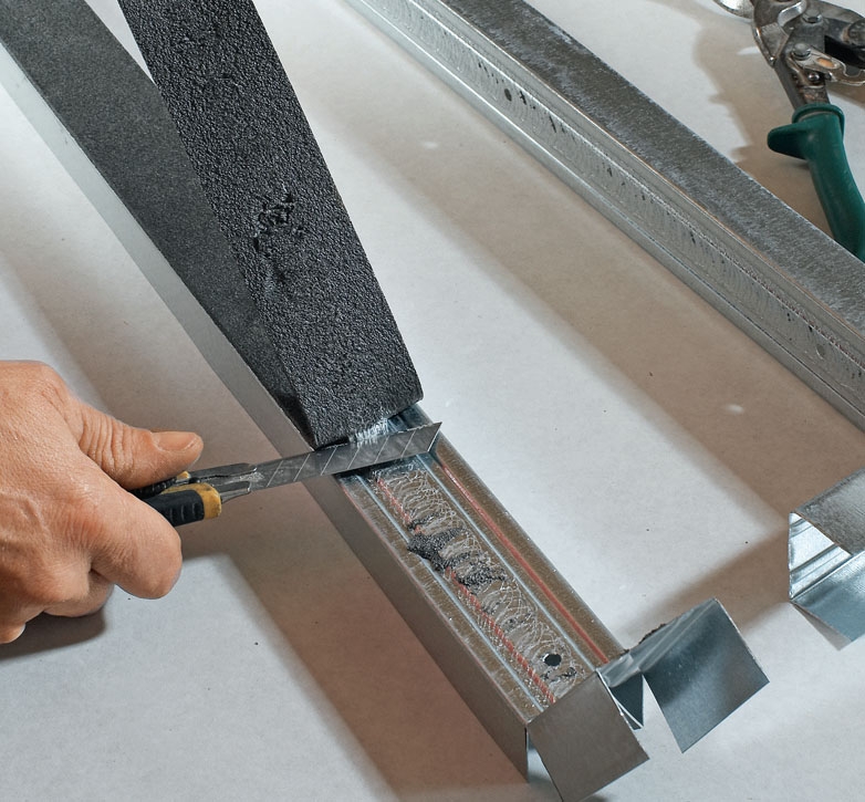 Skjær og trekk av den svarte skumgummien av skinna. Den sitter på topp- og bunnskinna for å luft- og lydtette hele veien rundt langs veggene.