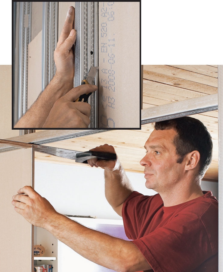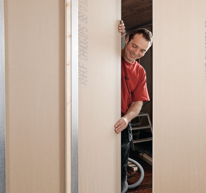 Gipsplatene som du skal kle stålskjelettet med, er lette å arbeide med. Når du skal skjære dem til, skjærer du på den ene siden med en hobbykniv. Deretter knekker du plata, for eksempel over en bordkant. Det frittskårne stykket henger nå i et tynt papplag som du skjærer over fra undersiden av plata.
