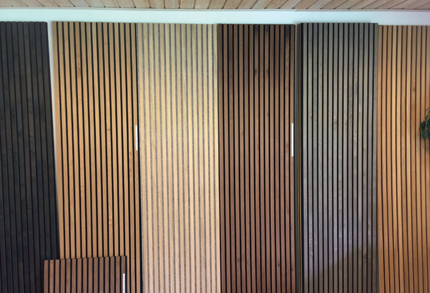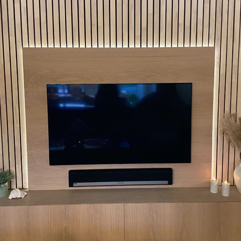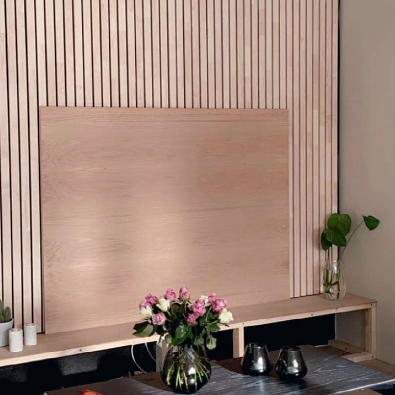 Lag et underliggende skjelett av 3-4 vannrette lekter du kan stifte fast stoffet til, samt montere de loddrette spilene i. Du har også muligheten til å bygge et TV-skap i bunnen av veggen, som her, der løsningen er en blanding av spiler og to Ikea-skap.