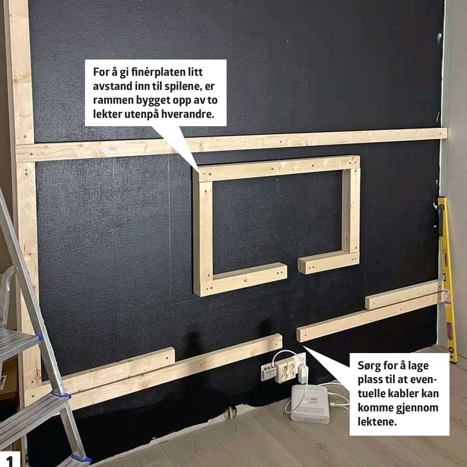 Monter de vannrette lektene. Her skal du ta høyde for hvilket underlag de skrus inn i, slik at du bruker riktige skruer og plugger. Her er underlaget en gammel trevegg. Monter en lekt i topp og bunn, og en på midten (bygger du uten skap, bør du fordele to på midten). Det er også nå du skal lage rammen til finérplaten.
