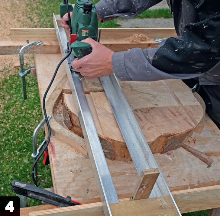 Spenn fast treemnet til en stabil bordplate med litt ekstra plass i sidene. I hver side av bordplaten skrus det fast to 48 x 48 mm lekter, med to rette bord utenpå som anlegg til føringsskinnen.