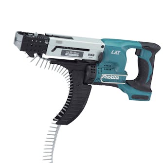 En batteridrevet gipsskrumaskin til skruer på bånd, gjør det til en lek å skru inn gipsskruer. Ettersom maskinen bruker skruer på bånd, blir skruprosessen både raskere og enklere. Det er en stor fordel at maskinen er batteridrevet. Da er ikke ledningen i veien når du beveger deg rundt.
