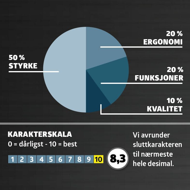 Slagtrekkerne testes og gis poeng i disse fire kategoriene: Styrke, ergonomi, funksjoner og kvalitet.