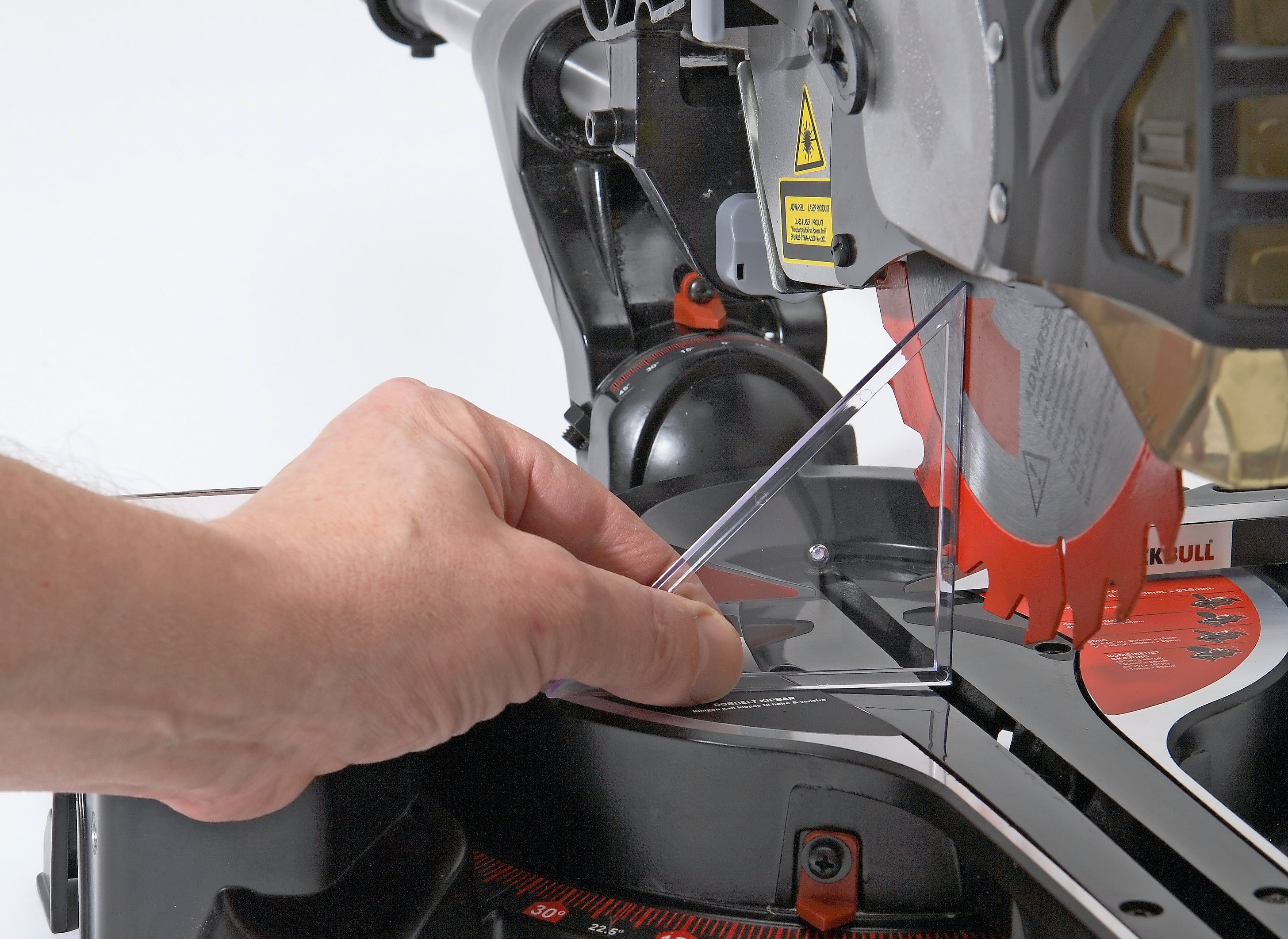 Normalt justeres vinkelen fra fabrikken. Vi formoder at det finnes en slags justerskrue med låsemutter, som stopper bladet i loddrett posisjon. Hvis du undersøker de bevegelige delene, vil du fort kunne se hvordan det fungerer, og hvilke skruer du skal stille på for å justere vinkelen på bladet loddrett. Du skal bruke en nøyaktig vinkel som du kan holde mot sagbordet og bladet samtidig. Til dette formålet er en liten tegnetrekant av plast godt egnet.