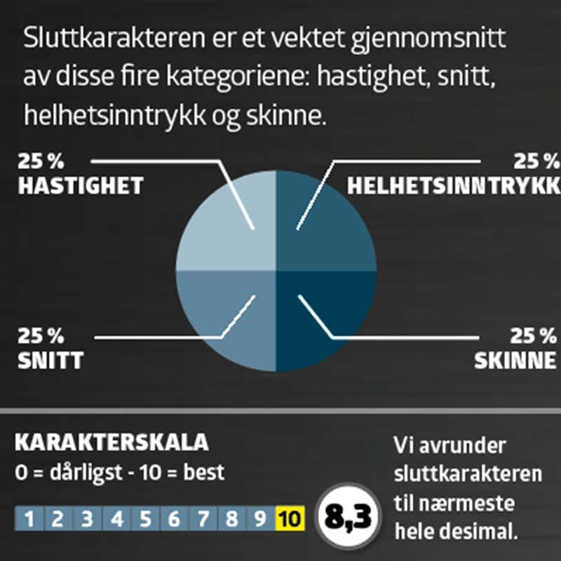 Sluttkarakteren er et vektet gjennomsnitt av disse fire kategoriene: hastighet, snitt, helhetsinntrykk og skinne.