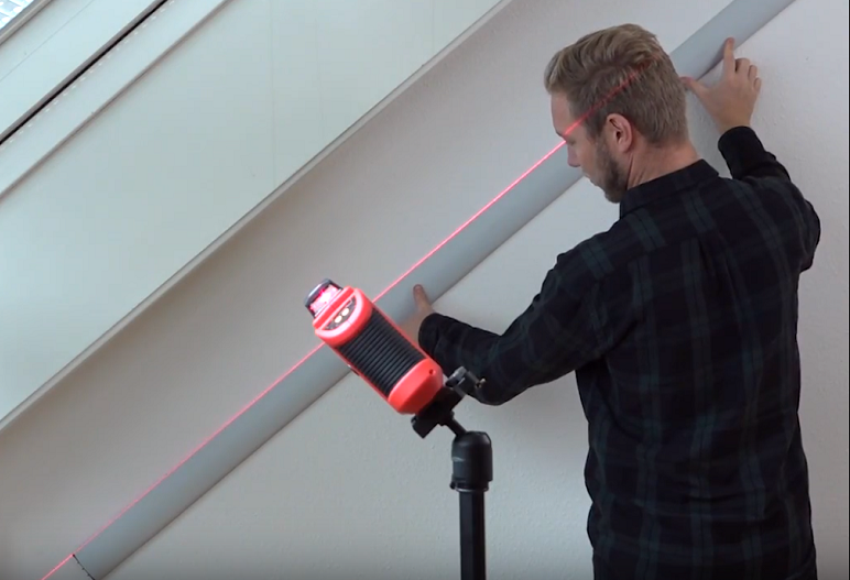 OBS: Det er ikke alltid at “rett” er det samme som “i vater”. Hvis du f.eks skal sette opp et gelender på en trapp, vil det tradisjonelle vateret bli for dårlig. Derfor kan du låse laserlinjen på sirkellaseren, slik at den heller sammen med selve apparatet, og du kan låse en skrå linje som går presist i takt med trappen.