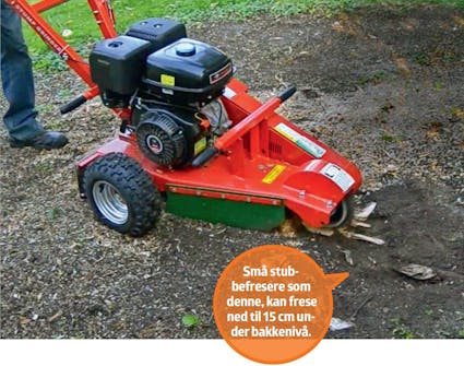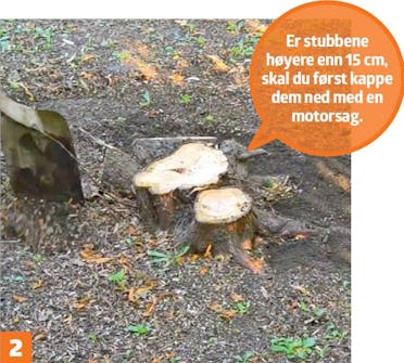 Fjern løs jord rundt stubben. Du skal IKKE grave under bakkenivå, for freseren skal kunne kjøre på området. Stubbene skal være maksimalt 15 cm høye når de freses.