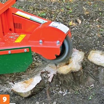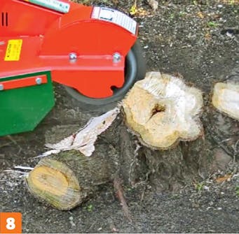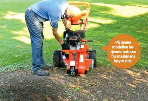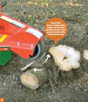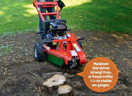 Når toppen av stubben er frest ned til bakkenivå, gjelder det røttene. Flytt maskinen rundt, og fres så langt ned du kan komme. Unngå å frese rett ned i bakken, for da blir tennene raskt sløve.