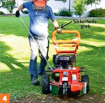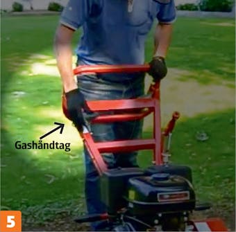 Lås fast det ene hjulet ved å trekke i håndbremsen. Ved nettopp å blokkere det ene hjulet, i dette tilfellet det venstre, kan du “svinge” freseren fra side til side i en pendelbevegelse.