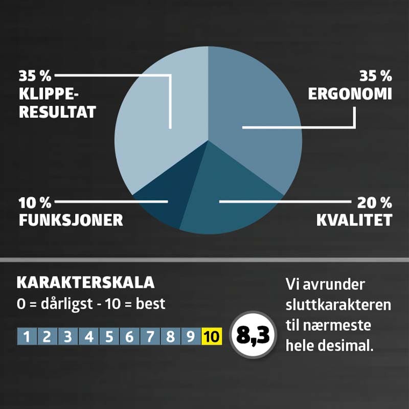 Gressklipperne testes og gis poeng i disse fire kategoriene: Klipperesultat, ergonomi, kvalitet og funksjoner.