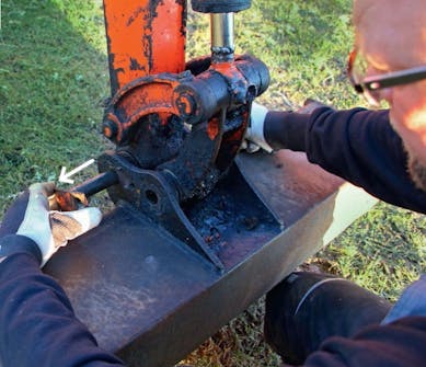 Kjør dozerbladet ned, slik at beltene hever seg litt i den ene enden. Bladet skal vende i samme retning som skuffen. Det gir maskinen en god stabilitet.