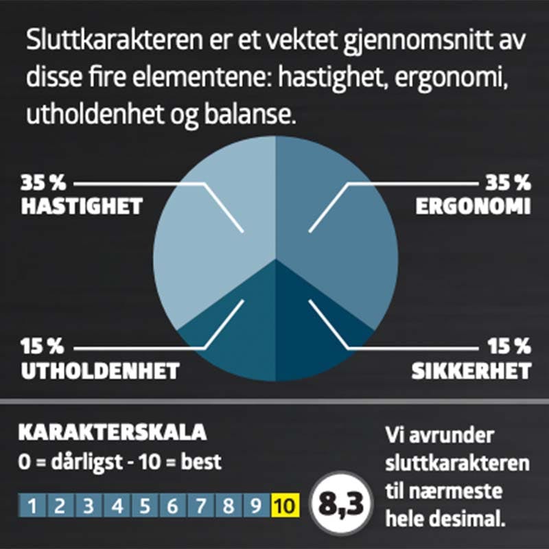 Sluttkarakteren er et vektet gjennomsnitt av disse fire elementene: hastighet, ergonomi, utholdenhet og balanse.
