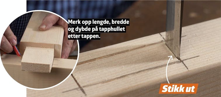 Stikk ut langs oppmerkingen. Hugg et par millimeter ned på alle fire sider. Den avfasede siden vender inn mot tapphullet.