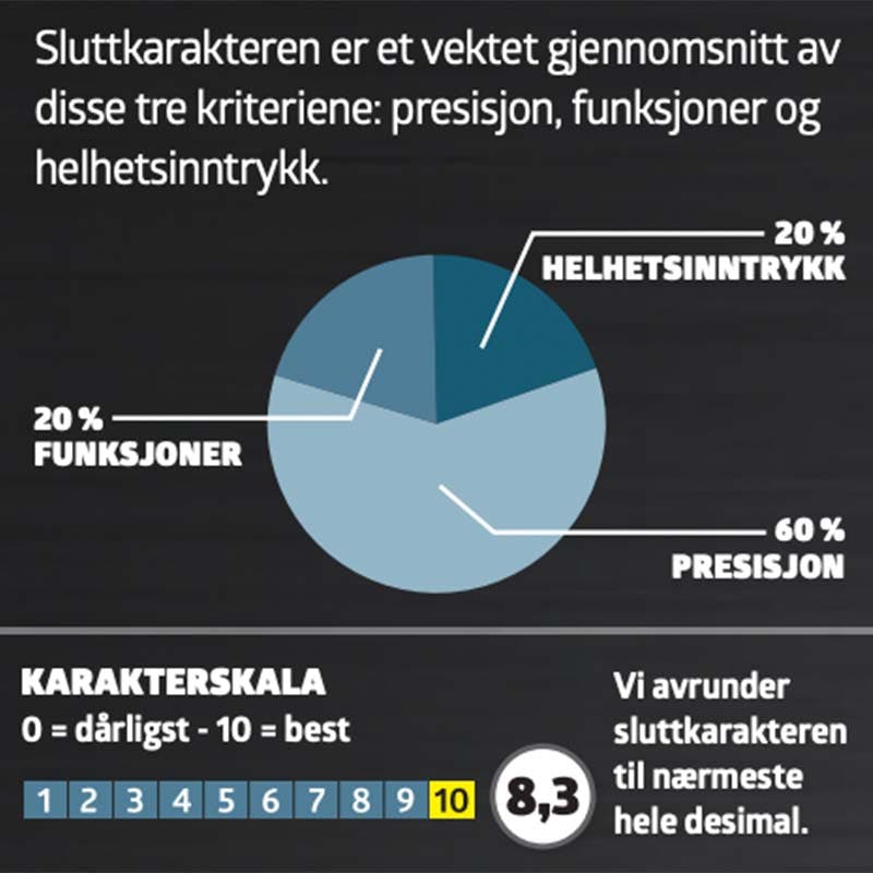 Sluttkarakteren er et vektet gjennomsnitt av disse tre kriteriene: presisjon, funksjoner og helhetsinntrykk.