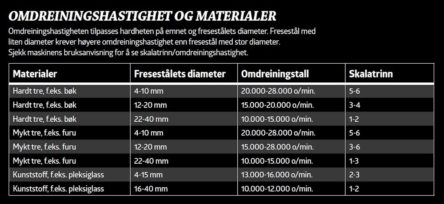 VARIABEL HASTIGHET er optimalt. Gir muligheten til å velge turtallet som passer til fresestålet og og materialet du skal frese i. Finnes ikke på alle maskiner.