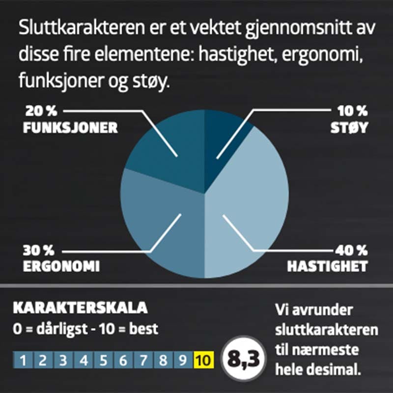 Sluttkarakteren er et vektet gjennomsnitt av disse fire elementene: hastighet, ergonomi, funksjoner og støy.