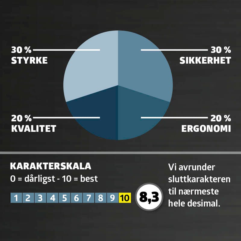 Vinkelsliperne testes og gis poeng i disse fire kategoriene: Styrke, sikkerhet, ergonomi og kvalitet.