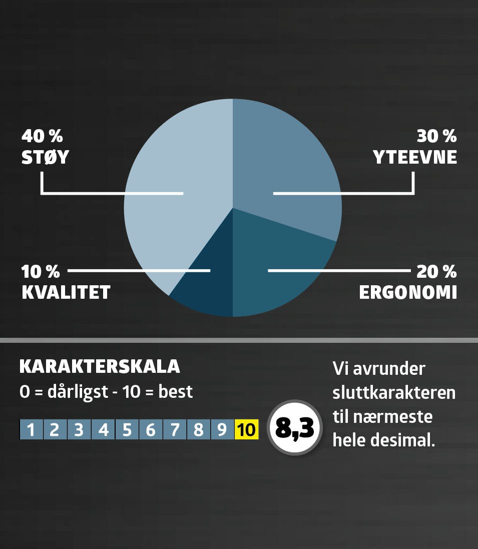 Kompressorene testes og gis poeng i disse fire kategoriene: Støy, yteevne, ergonomi og kvalitet.