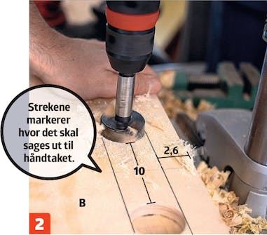 Bor ut til et håndtak (M) i platen (B). Det skal være midt på platen øverst. De to hullene bores med et 40 mm sylinder-bor, og plasseres 2,6 cm fra den øverste kanten med en avstand på 10 cm.