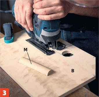 Sag ut til håndtaket med en stikksag langs strekene du har tegnet opp mellom de to hullene. Tilpass også en bit av en rundstokk (M), så den passer til håndtaket. Splitt den deretter på langs.