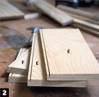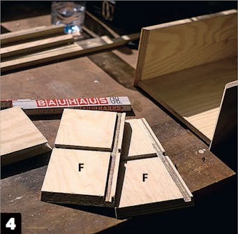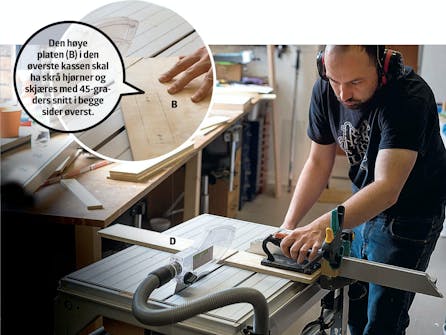 Sag ut delene. Sidestykkene (C, D, E, F, H og J) sages med et skrått 45-graders snitt i endene, slik at kassene får flotte sammenføyninger i hjørnene.