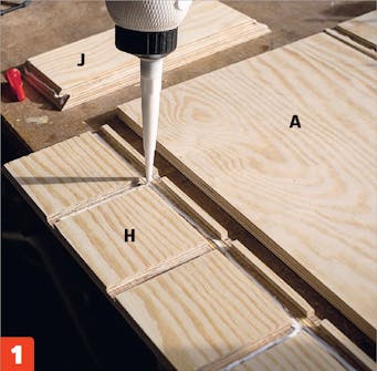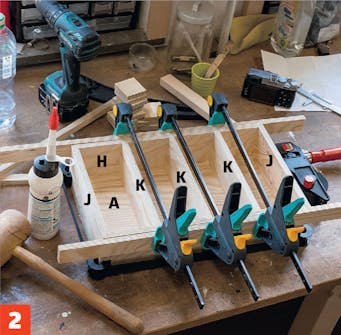 Delene limes sammen. Legg lim i sporene på sidestykkene (her H og J) og på hjørnene ved flatene på gjærskjøtene, før delene settes på bunnplaten (A).