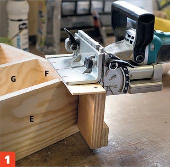 Sag spor i sidene (C, D, E, F, H og J) til bunnstykker og romdelere. Sporene skal ha en dybde på 5 mm. Det må sages i flere omganger for at sporet skal bli 12 mm bredt.