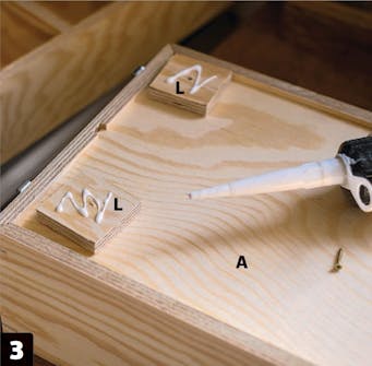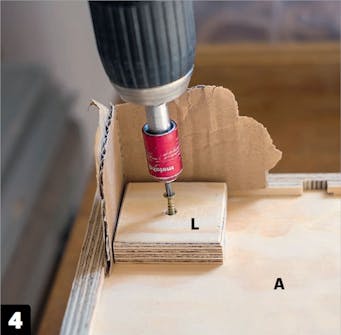 Legg trelim på baksiden av klossene (L), slik at de både limes og skrus fast til bunnplaten (A). Limet gjør at du nøye deg med én enkelt skrue per kloss.