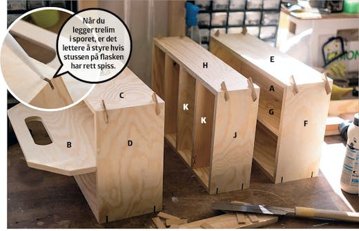 Det skal legges lim i alle sporene før du setter sammen kassene med bunn, en ramme og romdelere.